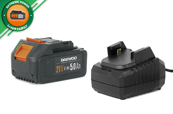 Аккумуляторная батарея 21 В / 5,0 Ач и зарядное устройство 2,5 А уже в комплекте