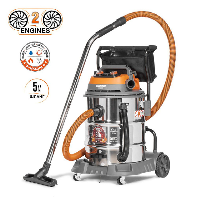 Увеличенная длина шланга до 5 м позволяет работать в труднодоступных местах не перемещая пылесос.